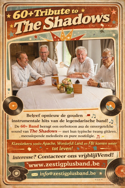 Wij zijn een 4 koppige zestigplussers die voornamelijk covers uit de jaren 1960/1970 spelen met een speciaal hart voor The Shadows (vroegere begeleidingsgroep van Cliff Richard) Hiermee kunnen we ook een avond/namiddag versieren ! Wij doen kermissen, bals, danszalen enz. www.zestigplusband.be
